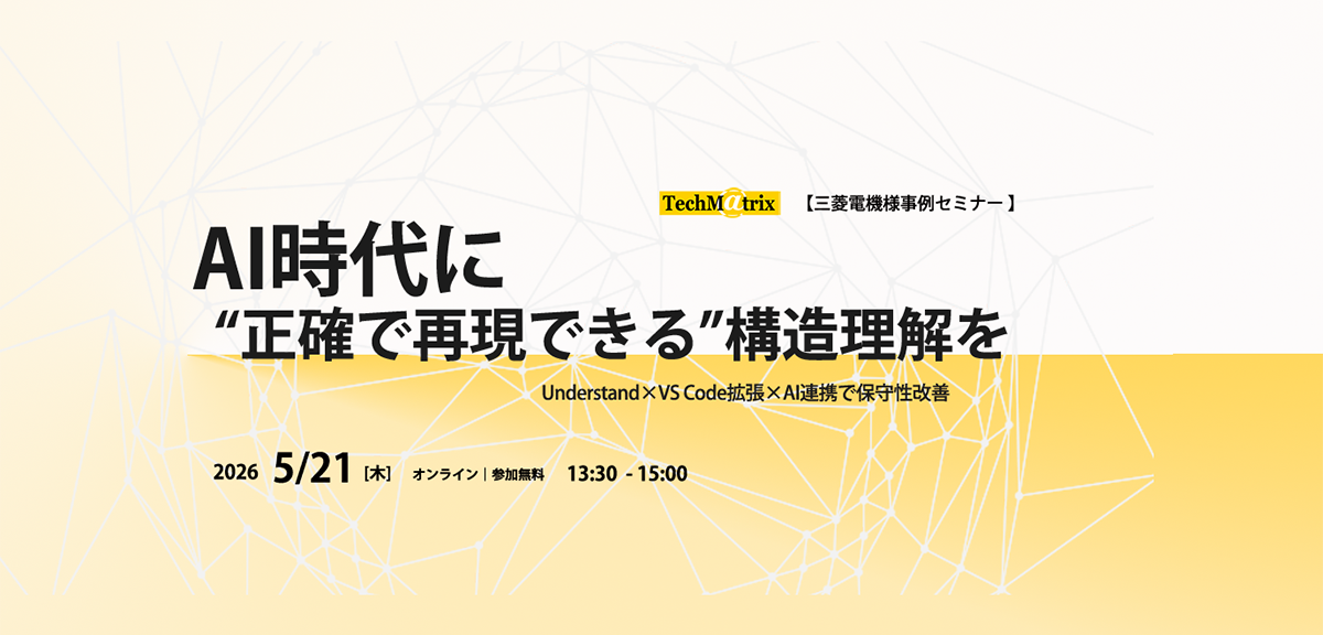 2026年5月21日(木)に、三菱電機様事例セミナー「AI時代に“正確で再現できる”構造理解を〜Understand×VS Code拡張×AI連携で保守性改善〜」をオンラインで開催します。レガシーコードは多くの現場に存在しており、そのすべて...