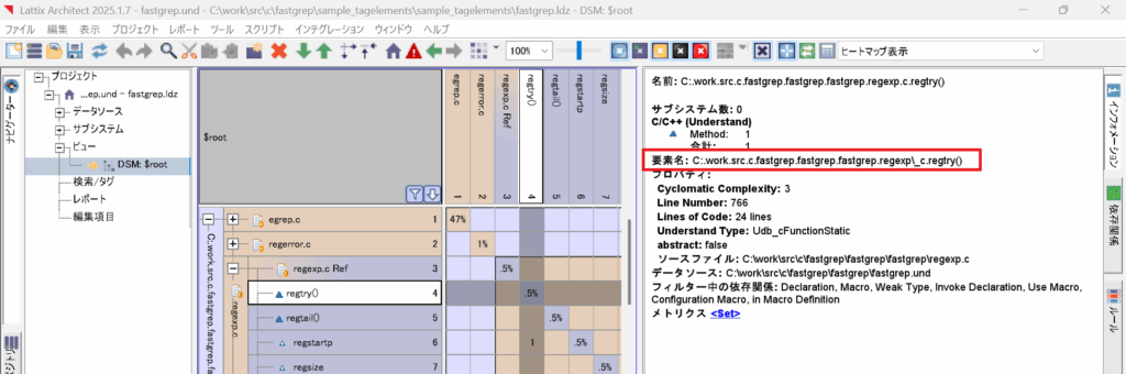 なお、Lattixの要素名は、以下のように、LattixArchitectを開きDSM上において対象要素を選択し、[インフォメーション]タブを開くことで確認いただけます。