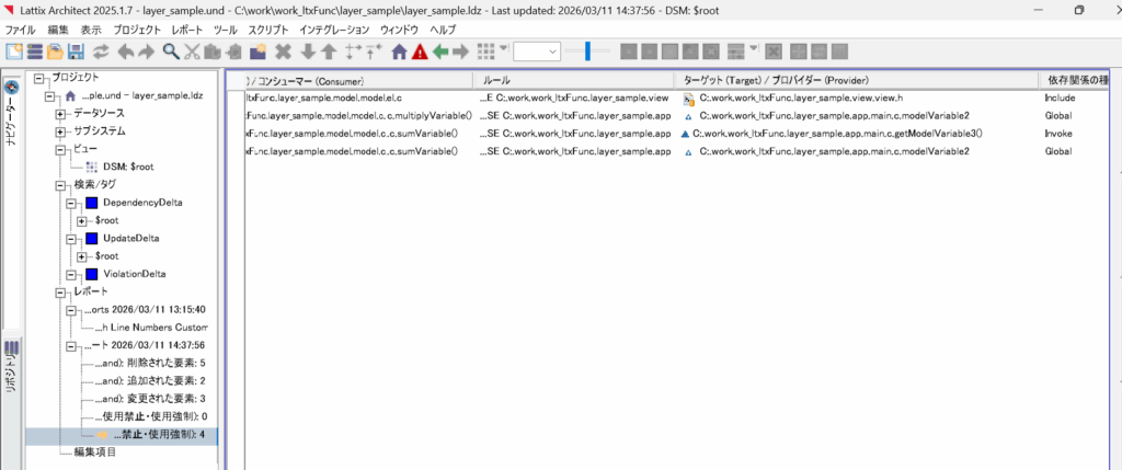 上記レイヤー設計に対し、違反した依存関係が列挙されています。