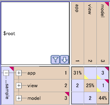 以下はサンプルコード(初期コード)を解析した結果のDSMです。