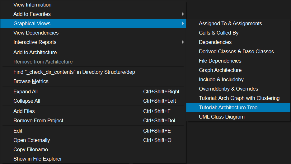 このチュートリアルでは、シンプルなアーキテクチャツリーグラフを生成する方法を説明します。この機能はUnderstandに既に組み込まれており、アーキテクチャブラウザーで任意のフォルダーまたはアーキテクチャを右クリックし、[グラフィカルビュー]-[Graph Architecture]を選択することで利用できます。しかし、このコードはグラフをニーズに合わせて拡張・調整するための優れたテンプレートとなります。