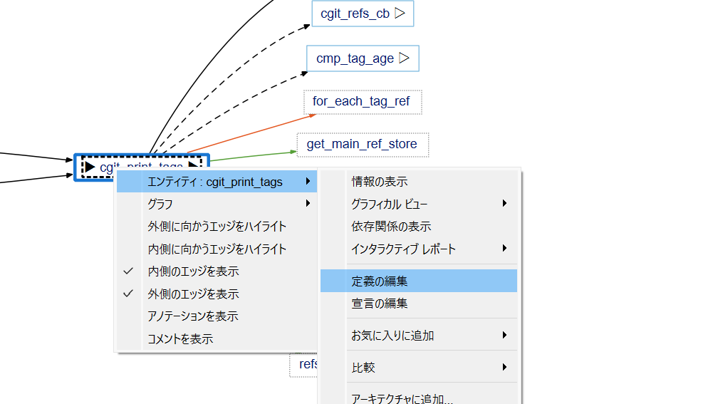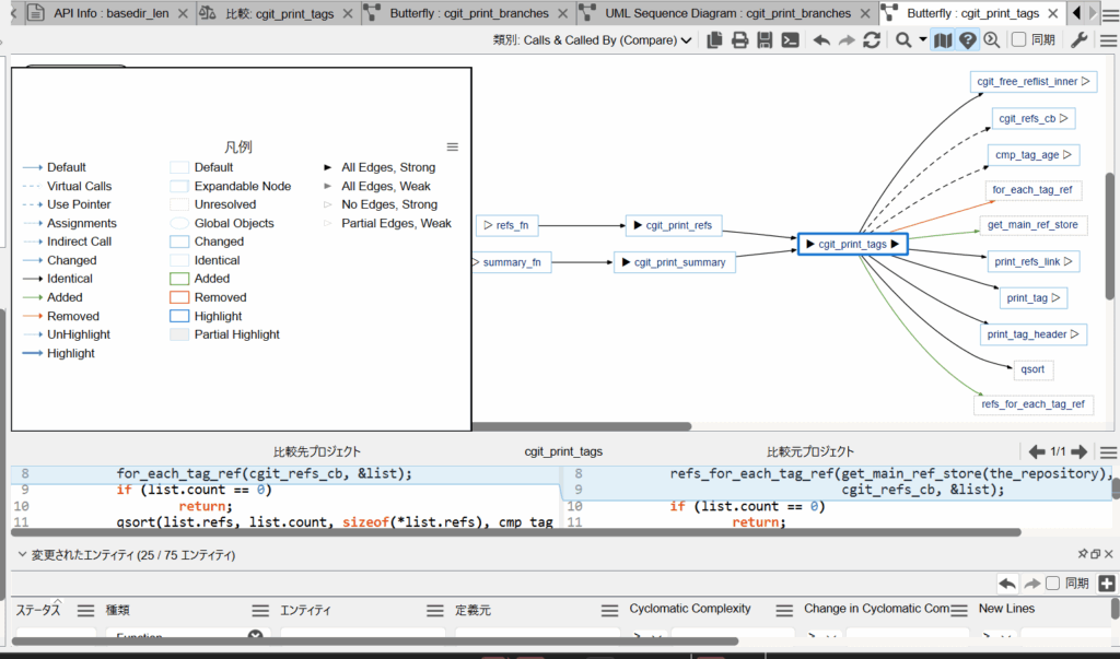 追加/変更/削除された依存関係は矢印に色付けがされており、追加変更/削除された関数にはノードの枠に色付けがされています。
