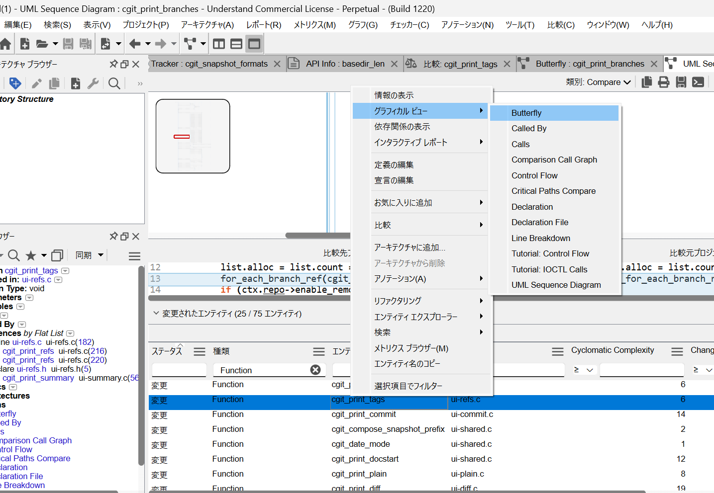比較画面から差分エンティティロケーターを開き、対象のエンティティをマウスオーバーし、右クリック[グラフィカルビュー]から、[Called By]や[Butterfly]、[Control Flow]、[UML Sequence Diagram]など多くのグラフをCompareグラフ(類別:Compareを指定)として利用できます。